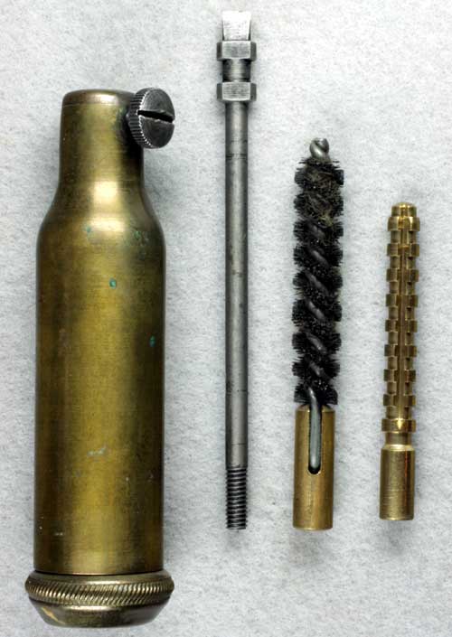 Genuine Swiss Luger cleaning kit and tools. Each piece marked with swiss "+". Includes tube and cap, screwdriver tip/rod, cleaning brush and cleaning jag. Kit is missing other cleaning jag. Very Good Condition.