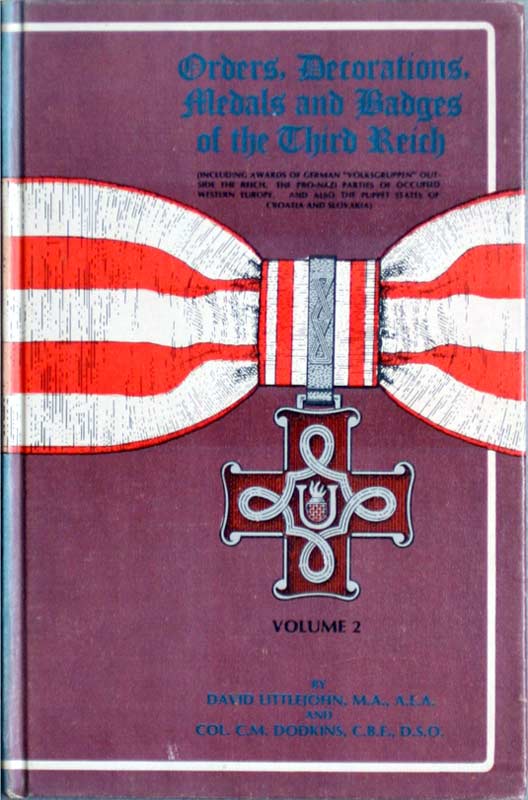 Orders, Decorations, Medals and Badges of the Third Reich Vol. 2 First Edition (1973) by David Littlejohn, M.A., A.L.A. and Col. C.M. Dodkins, C.B.E, D.S.O. 192 pages, Hardcover.