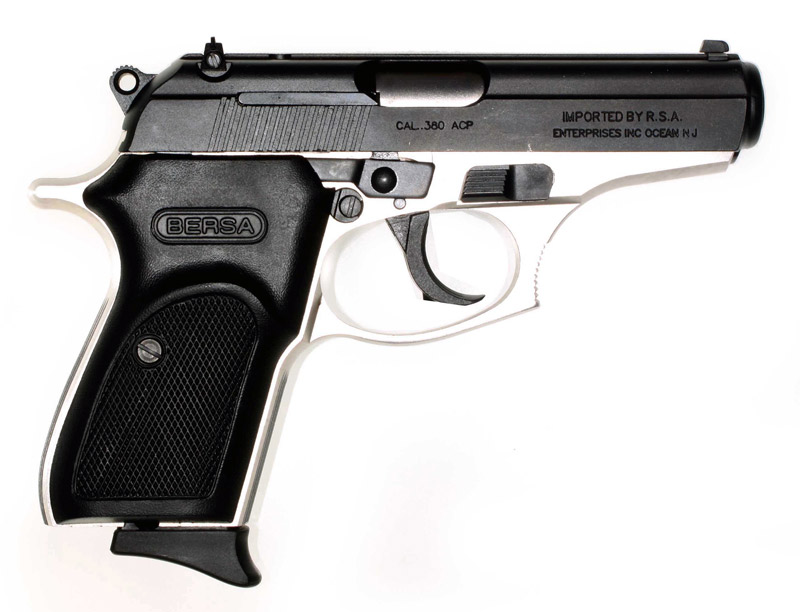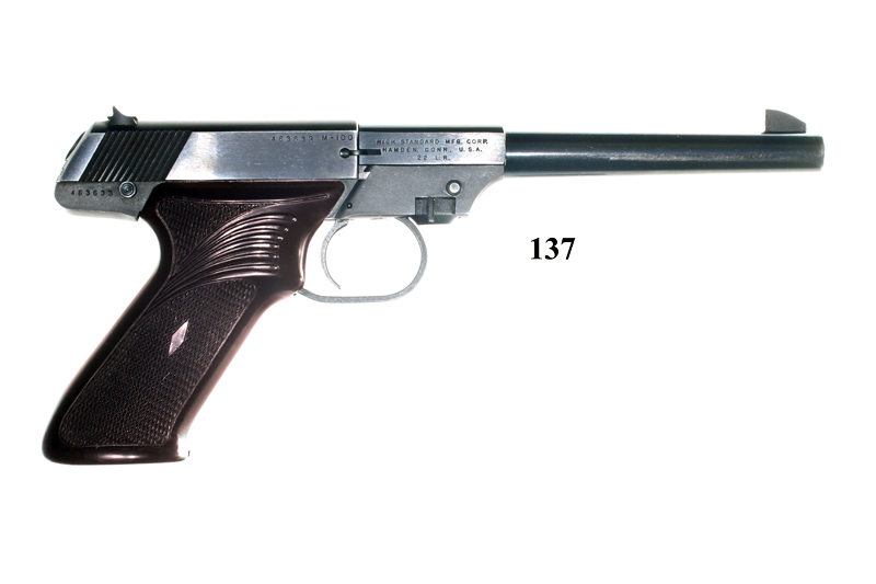 Arsenal SAI (Salient Arms International) 137. High Standard Dura-Matic M-100. Serial #463633. .22 LR. 10-shot magazine. 6.5 inch round barrel. Fixed sights. Blued finish. Brown checkered plastic one-piece grip. Blueing is worn in some spots along barrel due to holster wear. Excellent Bore. Good Condition overall. $250.00 + Shipping 1. Smith and Wesson Model 19-3 Revolver. Serial #4K795XX. "K-Frame". Chambered for .357 Magnum. 6 round capacity. 6" barrel. Blued finish. Checkered walnut grips. Very Good Condition with some very minor holster wear and a few very minor rust spots. $450.00 + Shipping [ S O L D ] 135. High Standard Model H-D Military. Approximately 150,000 produced. Serial #252326. .22 LR. 10-shot magazine. 4.5 inch barrel. Adjustable sights. External safety. Blued finish. Checkered Walnut Grips. Excellent bore. Excellent Condition. $600.00 + Shipping [ S O L D ] 152. Walther Model P5 Semi-Automatic 9mm Pistol. Serial #0485XX. Manufactured in Germany. Imported by Interarms, Alexandria, VA. 3.5 inch barrel. 9x19mm Parabellum. Combination matte black and high polish finish. Black plastic checkered grips. Includes 2 extra 8-round magazines, cleaning rod, instruction manual, target, and original box. Excellent Overall Condition. $950.00 + Shipping [ S O L D ] 153. Bersa Thunder .380 Semi-Automatic Pistol. Serial # C72837. .380ACP. Duo-tone finish. 7-round magazine. 3.5 inch barrel. New In Box. $400.00 + Shipping [ S O L D ] 156. Ruger Single-Six Revolver. Old Model. Serial #4095xx. Manufactured in 1964. Contoured Gate. 3-screw Model. .22LR. 6 round capacity. 5.5" barrel. Fixed sights. Blued finish. Walnut grips. XR3-RED marked anodized grip frame. Bore is Excellent. Very Good Condition with some minor holster wear and some very minor spots of rust. $475.00 + Shipping [ S O L D ] 158. Smith and Wesson Model 60 .38 Special Revolver. Serial #R313589. 5-round capacity. 2 inch barrel. Stainless Steel finish with checkered walnut grips. Fixed sights. Bore is excellent. Very good overall condition. Includes Bianchi #5BHL Brown Leather Holster. $550.00 + Shipping [ S O L D ] |