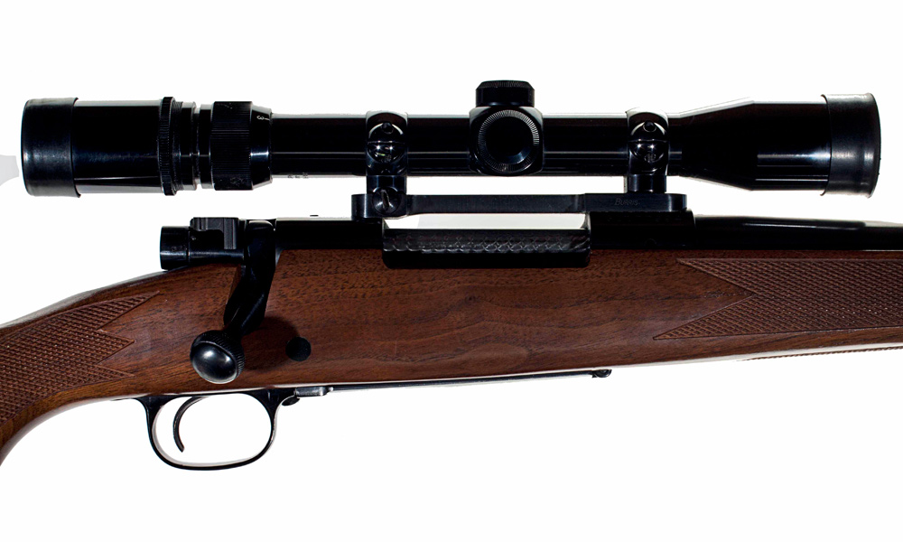 9. Winchester Model 70 Bolt-Action Rifle with Scope. Serial # G1177994. Manufactured in 1975. Chambered for .243 Winchester. 5-round integral box magazine. 22" barrel. Blued finish with checkered walnut stock. Burris scope mount with Bushnell Sportview 3X-9X, 32mm Scope. Includes leather sling with quick detach sling swivels. Forward end of stock has some scratches. Bore is excellent. Scope glass is clear. Excellent Overall Condition.