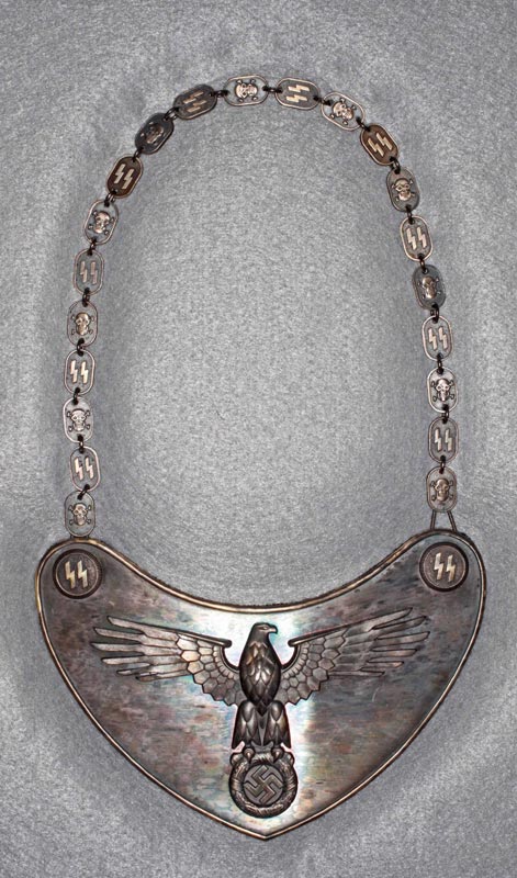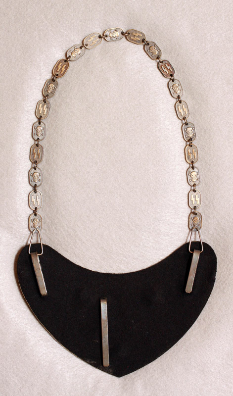 Model 1938 SS Standard Bearer's Gorget. Beautiful patina finish. Slight wear to finish of shield. Eagle and SS runic bosses are also very slightly worn and show exceptional detail. Original green felt backing has been replaced sometime in the past with black felt. Center tang on reverse is marked "RZM M1/128". Chain can be shortened or lengthened by the use of notched fittings located underneath chain retaining tangs. Skull and SS runes chain links are double sided and show great detail. Excellent overall condition. Additional pictures available upon request.