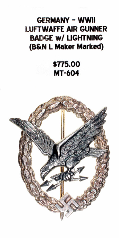 Germany, WWII - Luftwaffe Air Gunner Badge with Lightning (B&N L Maker Marked) |
