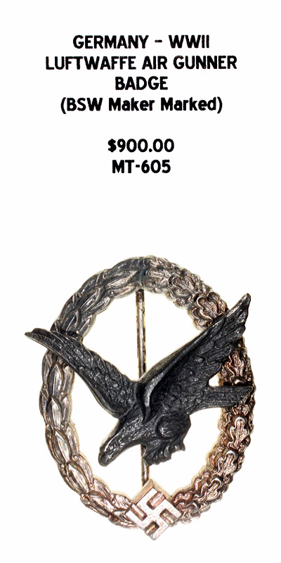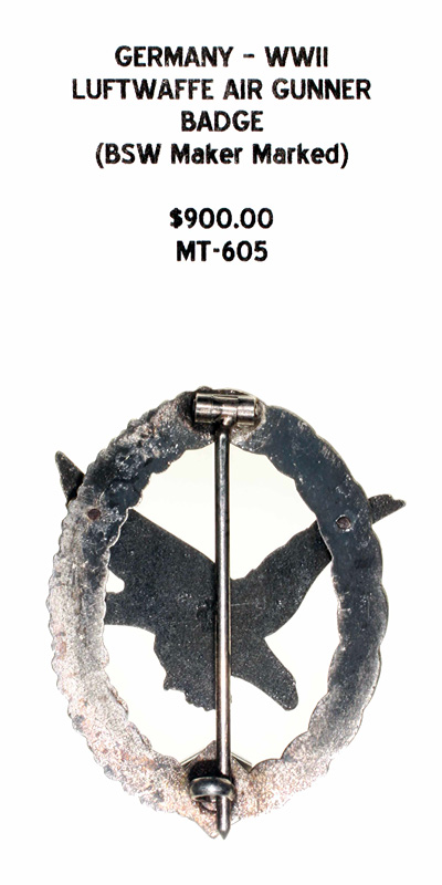 Germany, WWII - Luftwaffe Air Gunner Badge, (BSW Maker Marked) |