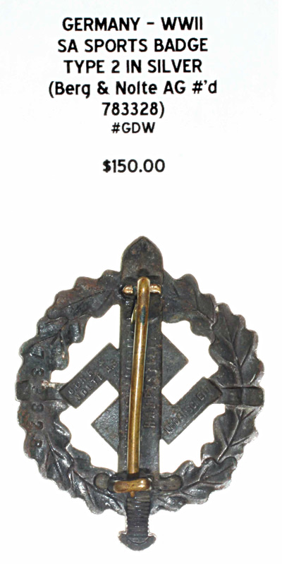 SA Sports Badge Type 2 in Silver (Berg & Nolte AG #'d 783328) |