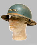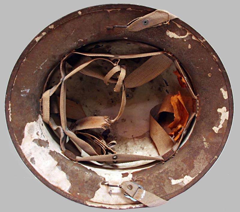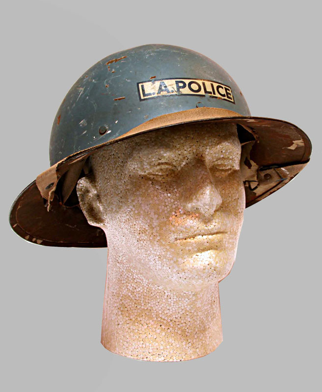 2. L.A. Police WWII Civil Defense Helmet. Stamped "U.S. Gov't Property O.C.D." under front side of rim. Light blue painted finish on outside. Inside of helmet retains some of the original off-white paint. Original liner is in fair condition.
