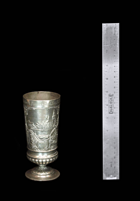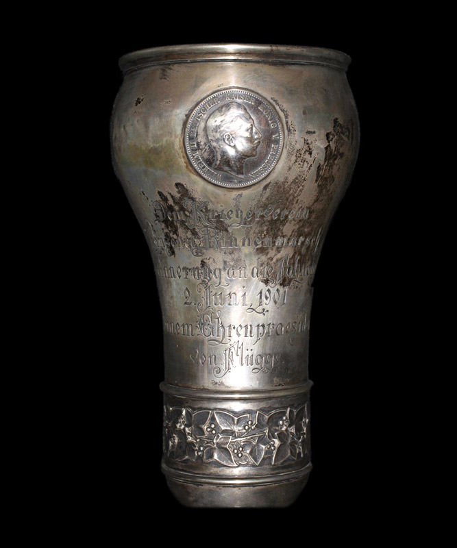 German Flag Dedication Honor Goblet, 1901 – 9" tall silver plated goblet with raised relief work of a bust of Kaiser Wilhelm above an inscription from the Kriegerverein Winsener Binnenmarsch, 2 June, 1901 to its Honorary President for the Dedication of Flags. Has a minor dent on ring and some minor dents along the outside of the bowl. Good Condition.