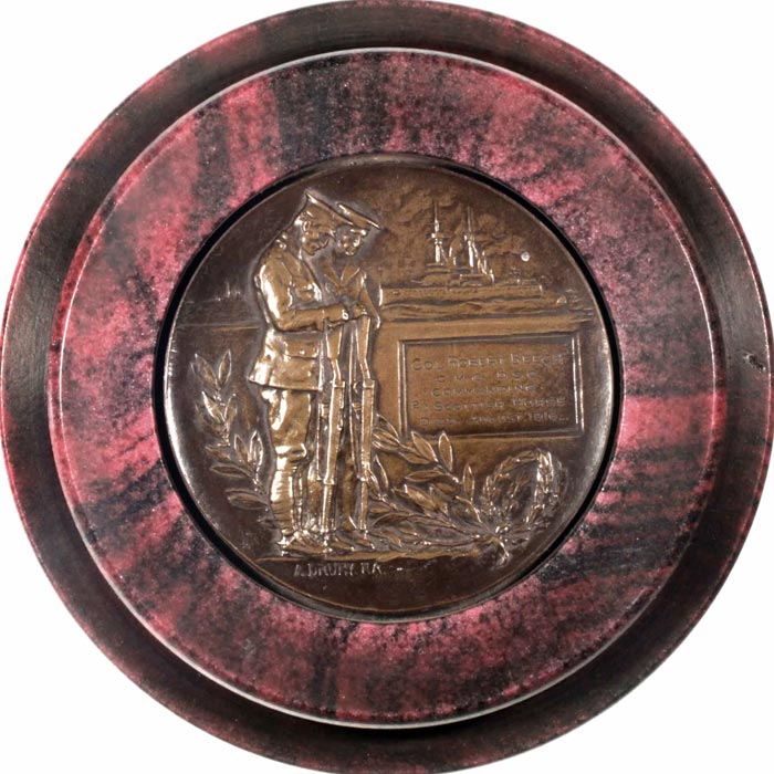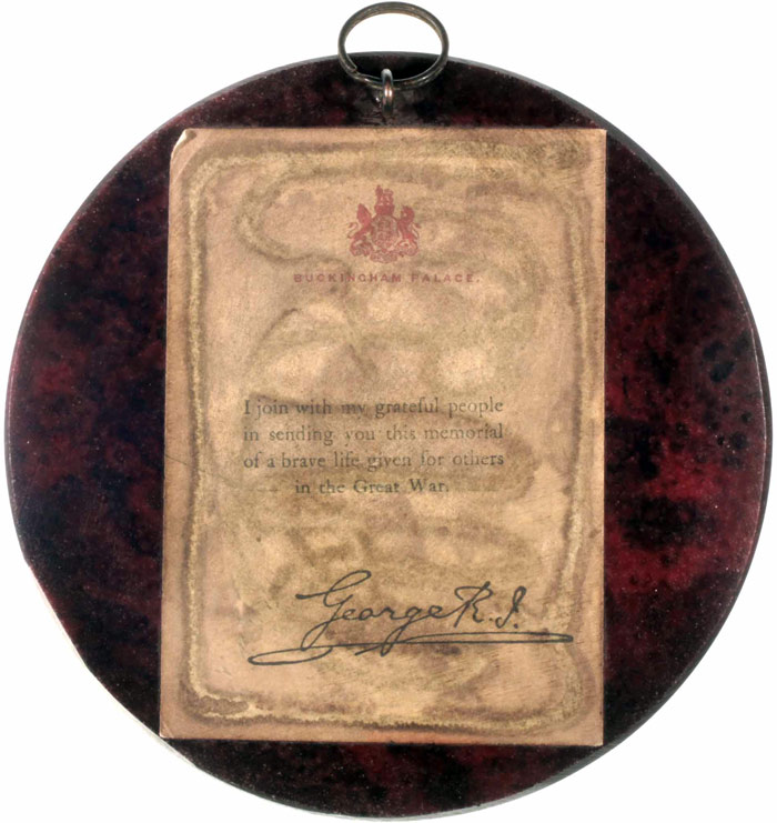 Memorial Plaque — A superb quality modern reproduction of a WW1 bronze memorial plaque, remembering 'Col Robert Beech C.M.G. D.S.O. Commanding 2/1 Scottish Horse". In 1916 It was decided that some form of memorial would be established for presentation to the next of kin of those that died during the war. A government committee was established to decide the nature of this memorial, and in August 1917 it was determined that it would take the form of a bronze plaque, the design of which would be decided by a public competition with a winning prize of £250. This design was a prototype that lost out to the now-familiar "Widow's Penny" design that was ultimately selected, which features Britannia with a British lion and the inscription, "He Died For Freedom and Honour." With facsimile version of King George V's condolence letter to the next of kin attached to the reverse.