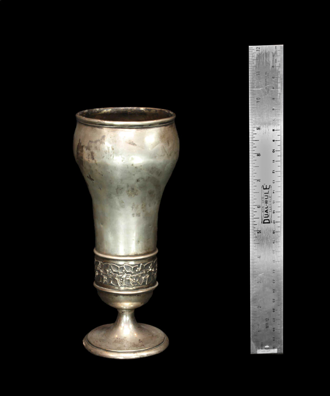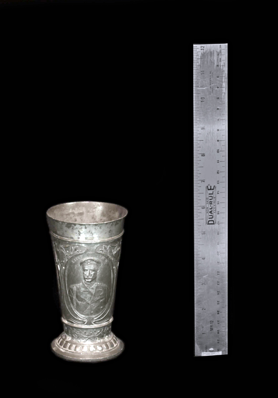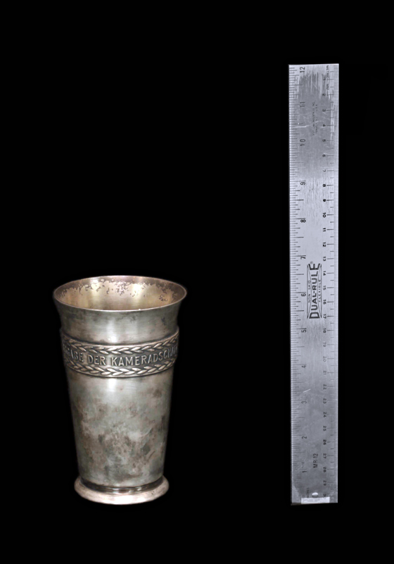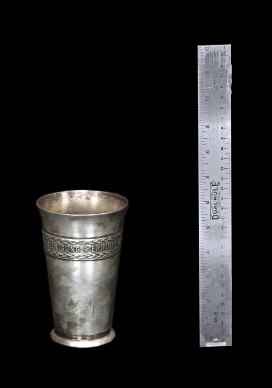 Germany WWII NSDAP Comradeship Cup – 5.75" tall, 3.5" diameter. Nickel finish. Ring is inscribed "ERINNERUNGSGABE DER KAMERADSCHAFTLICHEN VEREINIGUNG" with Swastika. Maker marked "Original Wellner". Very Good Condition.