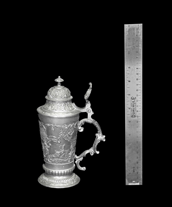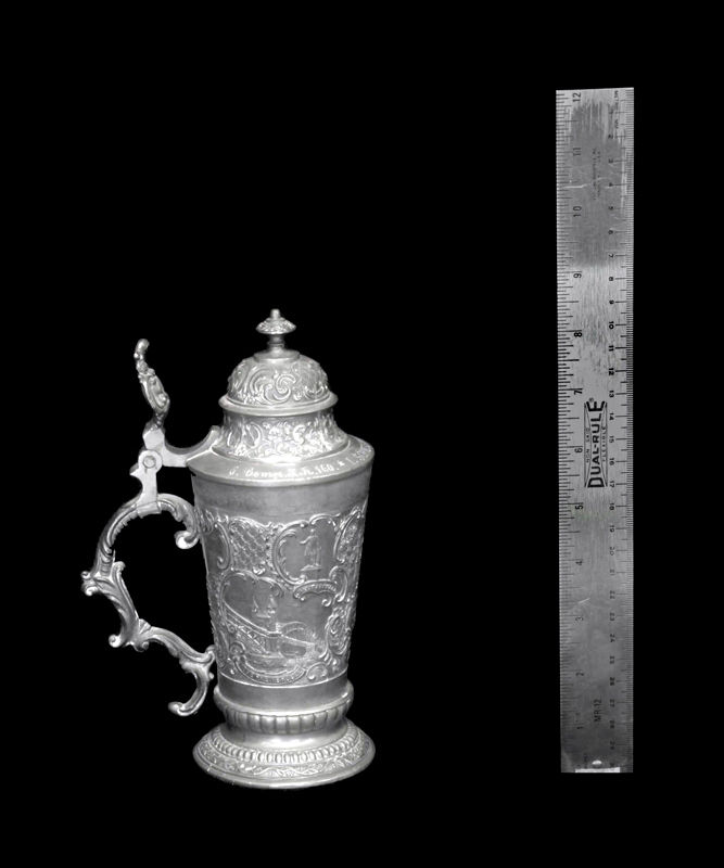 German Regimental Shooting Prize Pewter Goblet – 8.25" tall. Front panel depicts a large villa with the city crest of Bonn below, surrounded by monuments (bridges, statues, and other regional sights). "6 Comp JR 160 * I. SCHIESSPREIS * Einj. Gefr. Keldenich" engraved on the lid. Dated 1.8.1900 with "Gesetzlich Geschutzt F & M N." stamped on the bottom. Excellent Condition.