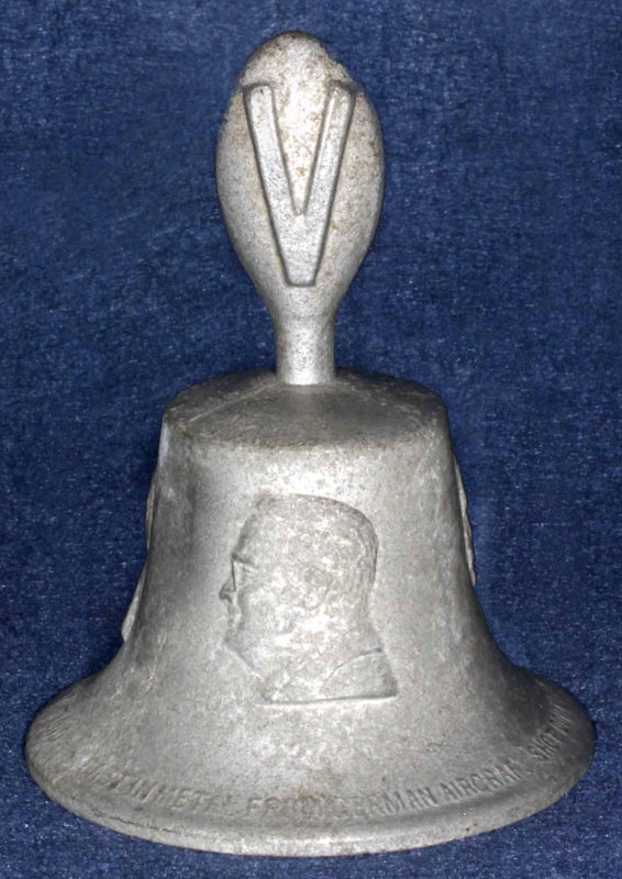 Victory Bell — Made from aluminum alloy collected from German planes that crashed on British soil during the “Battle of Britain”. Originally sold in aid of the Royal Air Force Benevolent Fund during the first Battle of Britain Dinner held at the Hungaria Restaurant directly after V.E. Day. Designed with the profiles of Churchill, Roosevelt, and Stalin on the side with a “V” for “Victory” on the handle. “Cast In Metal From German Aircraft Shot Down Over Britain 1939/45” and “RAF Benevolent Fund” cast around the base of the bell. Bell is in Good Condition overall. There is some slight oxidation, but the text is legible and profiles are clear and visible.