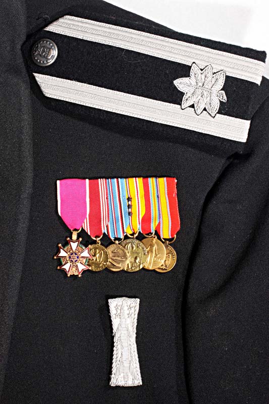 1. U.S.A.F. "Mustang" Lt. Colonel Mess Dress Jacket. 1970's era jacket manufactured by Lauterstein's with "Missileman" insignia. Miniature medals are WWII era and include the Legion of Merit, Good Conduct Medal, American Campaign Medal, Asiatic Pacific Campaign Medal, Victory Medal, and National Defense Medal. Excellent Condition.